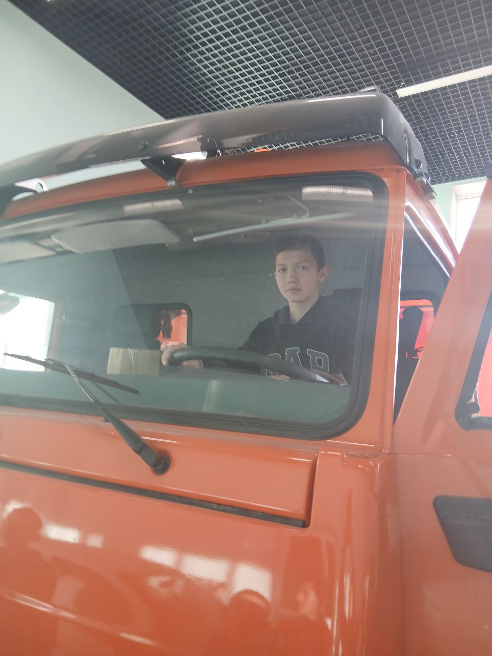 Кульминацией визита стало посещение настоящей автомастерской! Ребята даже смогли попробовать себя в роли водителя, когда сели за руль тренажёра.